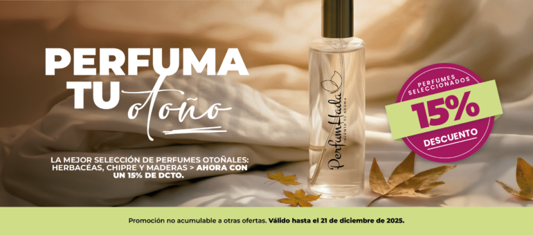 Y en Perfumhada queremos que vivas esa sensación a flor de piel. Por eso, durante un tiempo limitado, tienes un 15 % de descuento en perfumes herbáceos, amaderados y chipres —las fragancias que mejor acompañan esta temporada.